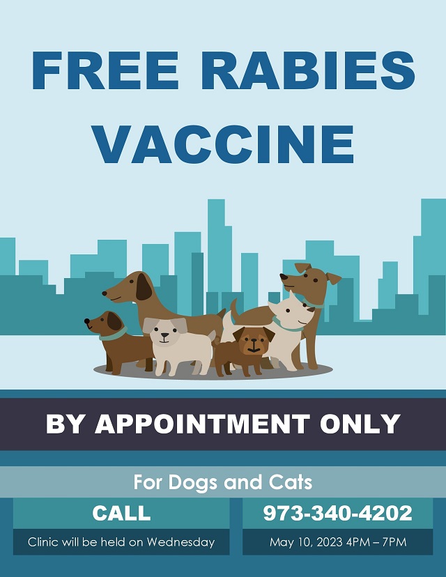 Free Rabies Clinic Posted February 01, 2023 Wednesday, May 10, 2023 4:00pm - 7:00pm BY APPOINTMENT ONLY 973-340-4202