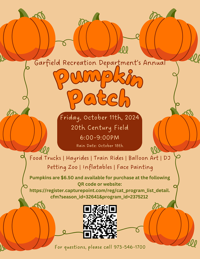Posted September 17, 2024Get ready for a night of fall fun at the Garfield Recreation Department's Annual Pumpkin Patch! Bring your family and friends for an evening filled with festive activities, food, and entertainment.